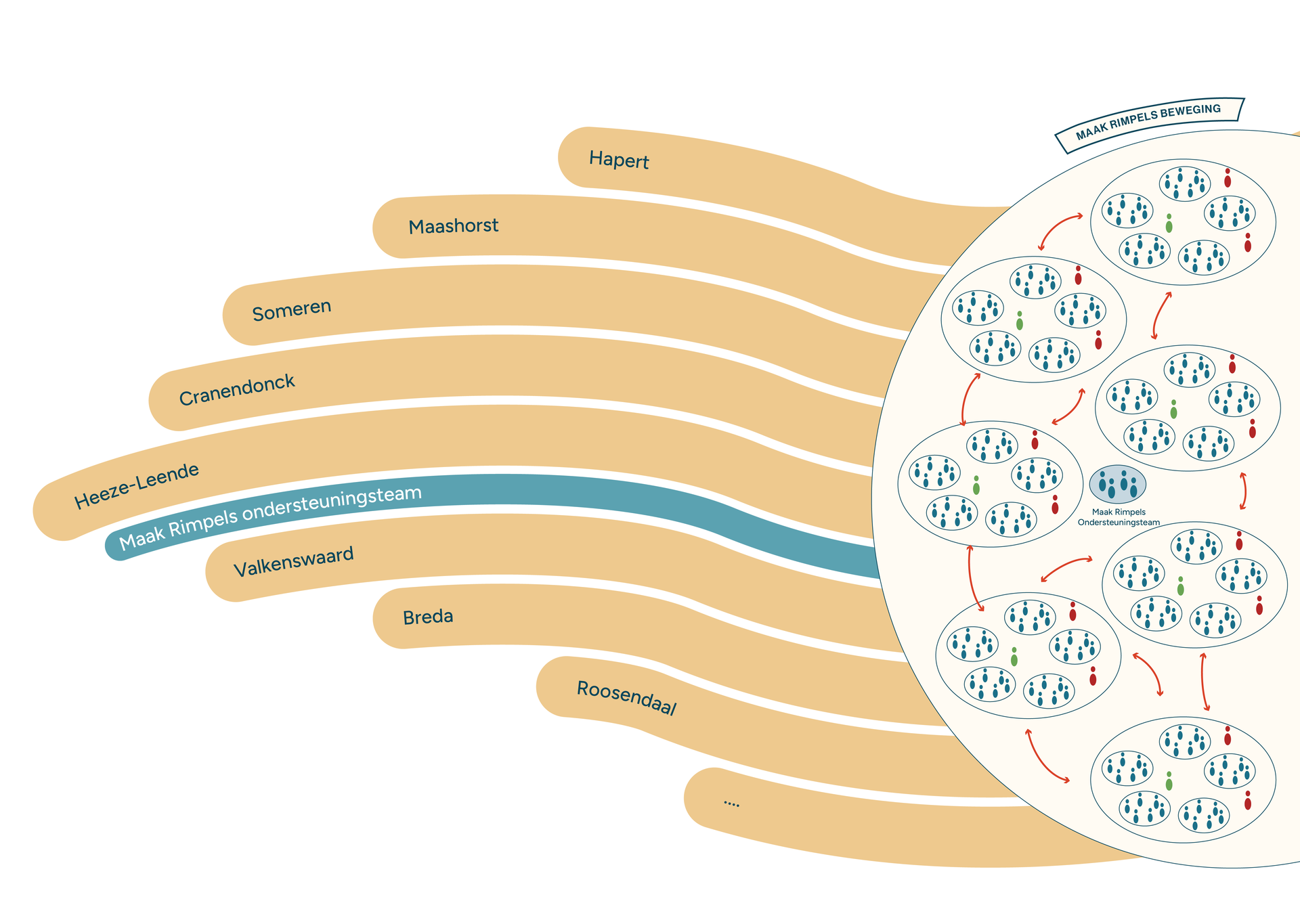 Deze duurzame peer to peer gemeenschappen vormen samen een buurtbeweging. Die ontstaat door een lokale initiatiefnemer zoals een seniorenvereniging, zorgcoöperatie, zorg-of welzijnsorganisaties die samen met het Maak Rimpels ondersteuningsteam de beweging opstart.