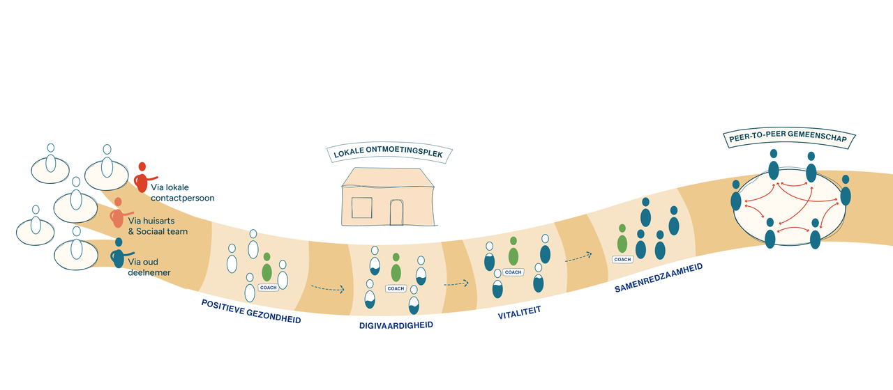 Bewoners komen via lokale contactpersonen, huisartsen of PoH’s, het sociaal team van de gemeente en oud deelnemers terecht in een groep van ongeveer 15 deelnemers. Onder begeleiding van professionele coaches en vrijwillige peers werken ouderen in hun eigen leefomgeving aan hun persoonlijke hulpbronnen en sociale veerkracht. Dat doen zij in vier samenhangende onderdelen - Positieve Gezondheid, Digivaardigheid, Vitaliteit en Samenredzaamheid.